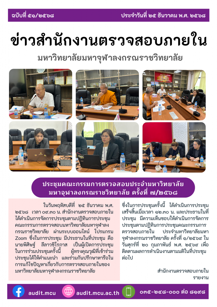ข่าวกิจกรรม / ข่าวประชาสัมพันธ์ / ประมวลภาพการตรจประเมินฯประชุมคณะกรรมการตรวจสอบประจำมหาวิทยาลัยมหาจุฬาลงกรณราชวิทยาลัย ครั้งที่ ๗/๒๕๖๘ December 25, 2025December 25, 2025 - by เว็บมาสเตอร์