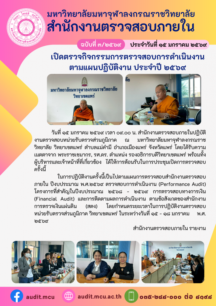 ข่าวกิจกรรม / ข่าวประชาสัมพันธ์ / ประมวลภาพการตรจประเมินฯเปิดตรวจกิจกรรมการตรวจสอบการดำเนินงาน ตามแผนปฏิบัติงาน ประจำปี ๒๕๖๙ (วิทยาเขตแพร่) January 15, 2026January 15, 2026 - by เว็บมาสเตอร์